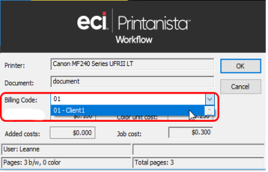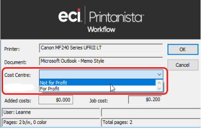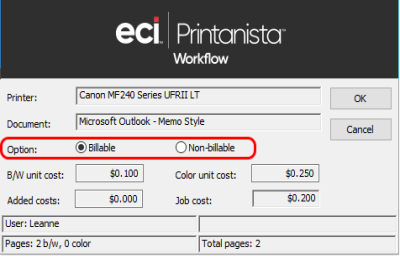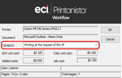 - Non-validated – Presents a free-form text entry field to the user. In the example below the field asks for a reason for printing. The user can type any information and the data is simply gathered.