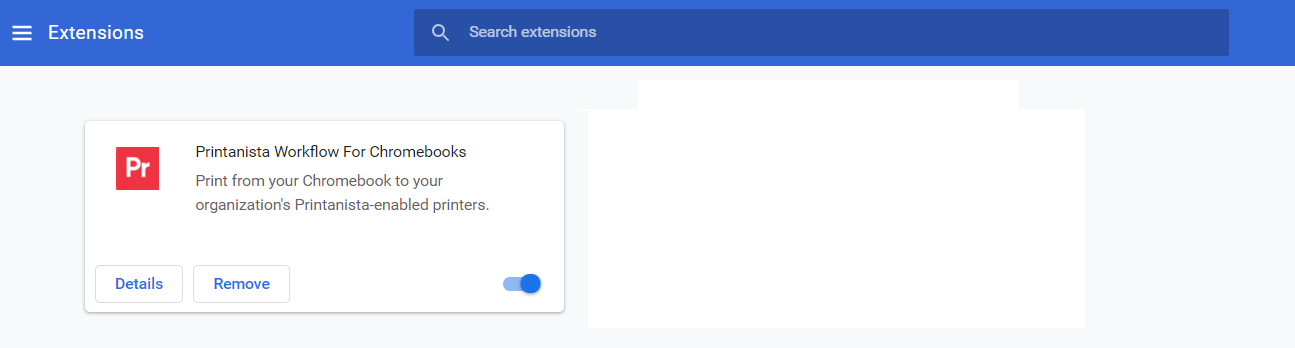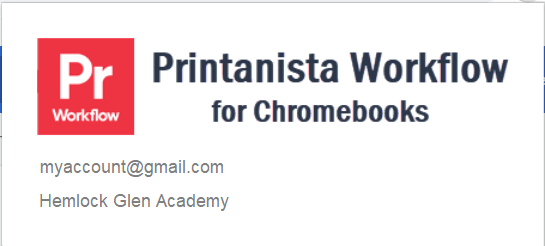 - Select the extension to open the status window, which will display your account email ID and the Printanista Workflow organization to which that email ID belongs.If the ID or organization are not correct, ensure you are logged into your Chromebook with the same email ID which is associated with your organization’s Printanista Workflow account. If you are not logged on with a Printanista Workflow email, you will not be permitted to connect to your organization, or print to those printers. You can add your Chromebook email ID to your Workflow user account using My Workflow.