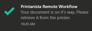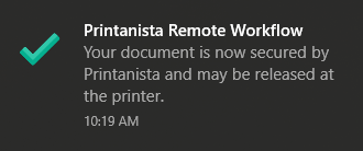 - If you have popup messages enabled, you will receive confirmation of your print job submission to the Printanista Workflow printer. The message will vary depending on whether or not you have selected a secure release printer.