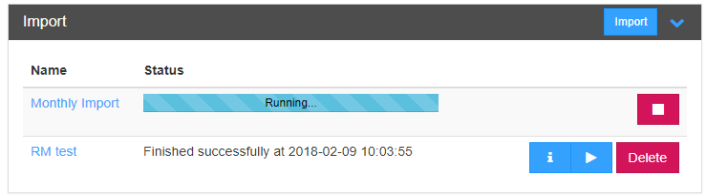 As you create Import tasks, the activity is updated in the User Import/Export screen. You can re-run an import task using the same settings as many times and as often as necessary. The tasks you create appear on the screen until you specifically delete each one, allowing you to run the task multiple times or even on a set schedule.